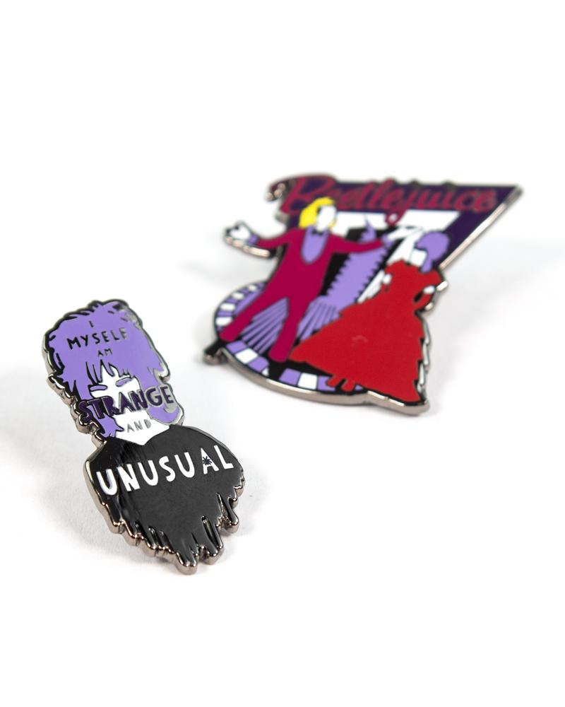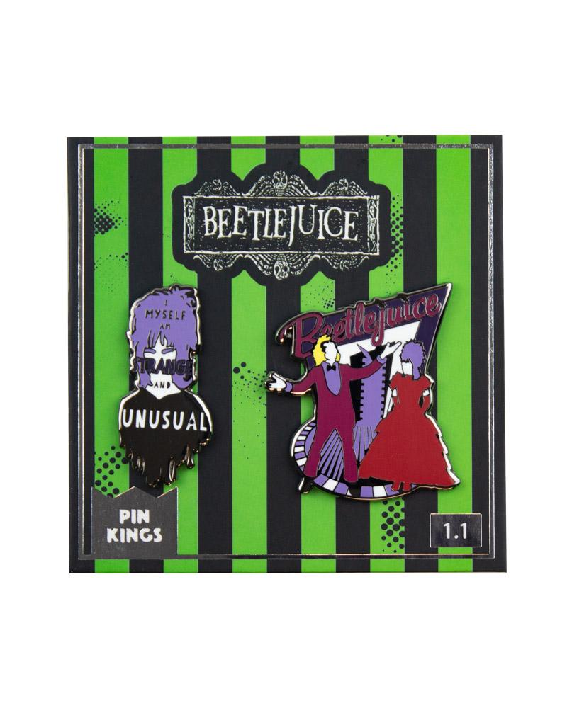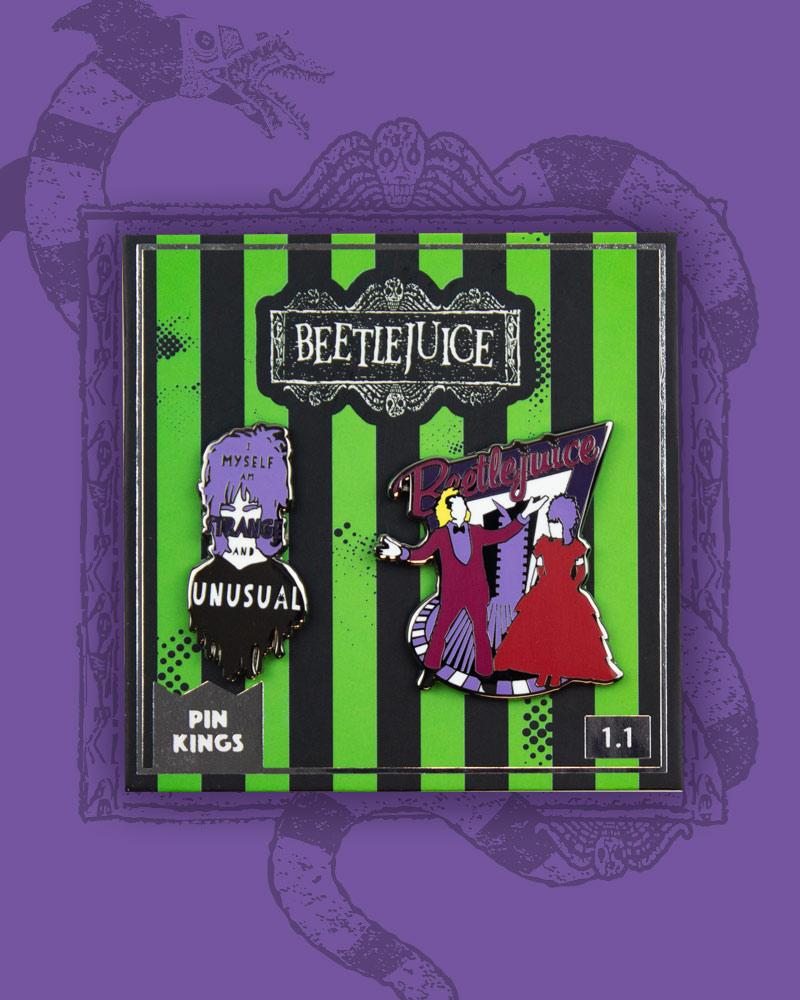 - Zwei Stifte in hochwertigem emailliertem Metall mit einem brillanten Finish mit Mustern, die vom Kult -Horrorfilm inspiriert sind, Beetlejuice auf einer Support -Karte.