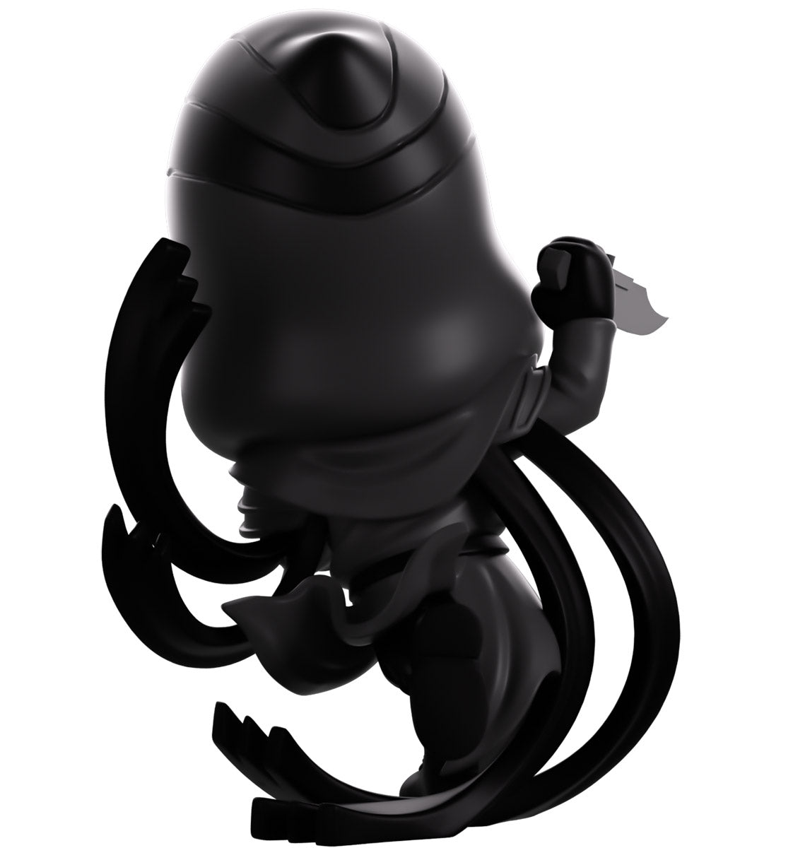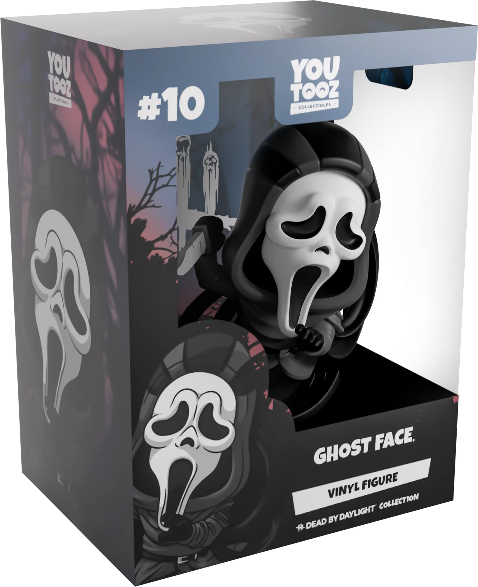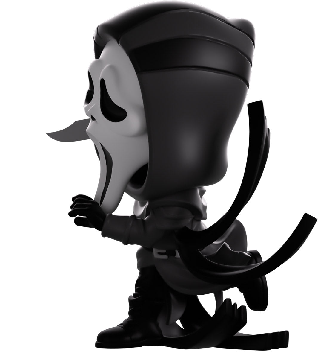 Ghost Face is here and he's targeting Youtooz as his next victim! Standing at 4.7 inches tall and pointing a gloved finger forward in a menacing manner, ensuring you know you're next, he brandishes a blood-soaked hunting knife in his right hand, fresh from his latest victim. With a loose black hood pulled up to a point at the back of his head and its opening resting around an iconic white mask, his gaping mouth stretches into an elongated scream as bright red blood drips from its top and trickles down from sunken eye holes. Presenting a figure that imbues the truest form of fear, a long, tattered robe envelops his body with its jagged ends swirling around his arms and legs. The outside of his wrapper sees a thick layer of blood dripping from the top. While the interior is a black background with thin red lines and blood splatters on its walls, this continues onto the protective packaging where its silhouette can be seen through the large clear window on the front. This collectible comes in an embossed matte protective outer sleeve and a custom-sized plastic protector for maximum protection during shipping.