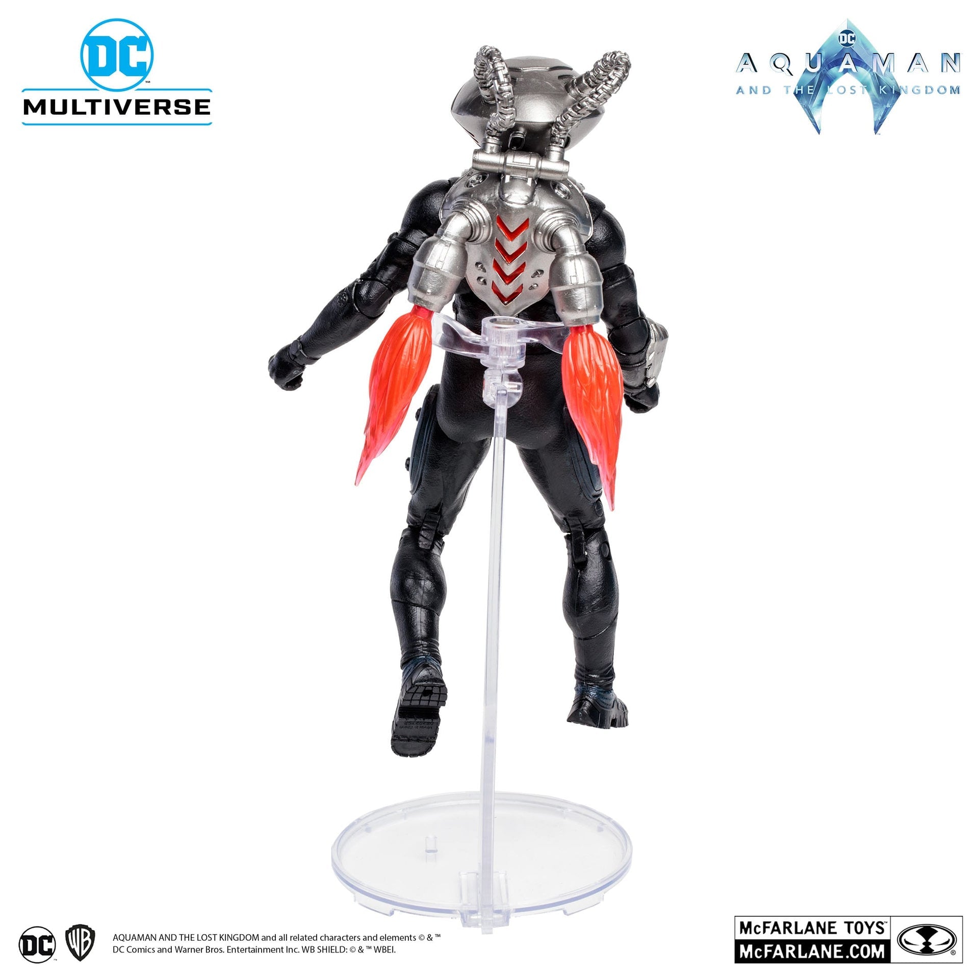 - Black Manta comprend un jet pack avec des flammes et un socle de vol
