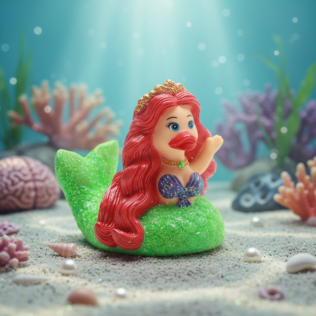 Ses détails soignés — coquillages violets, paillettes étincelantes, posture élégante — en font un cadeau idéal pour les enfants, les amateurs de fantaisie ou les collectionneurs de rubber ducks originaux.