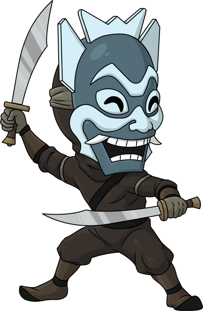 A 4,8 pouces, le Blue Spirit débarque chez Youtooz. Il est vêtu d'une chemise marron à manches longues et d'un pantalon assorti. Ses deux bras sont posés dans une position défensive car ils brandissent tous les deux des épées tranchantes. Couvrant son visage est un masque bleu qui est attaché sur sa tête avec 3 sangles attachées derrière lui. Le sourire sur le masque présente un ensemble complet de dents avec deux crocs acérés qui dépassent. L'extérieur de son emballage à double paroi montre une scène magnifiquement illustrée pendant la nuit, avec la silhouette de Blue Spirit en mouvement. Le manchon de protection est un dessin des 4 éléments.