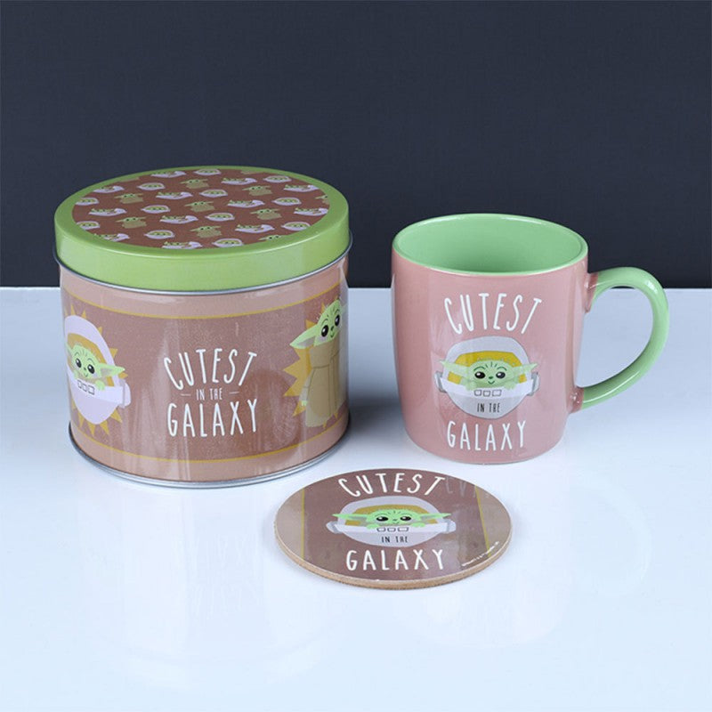 Cette boîte cadeau métallique Bébé Yoda The Mandalorian propose une tasse et un sous-verre assortis. Sous licence officielle Star Wars.
