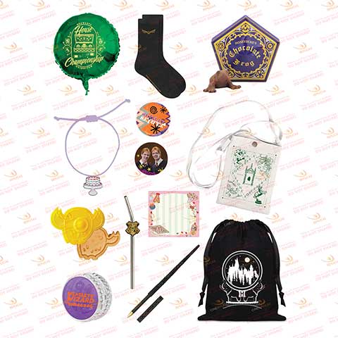- Contient sac shopping, pin's, collier, gants, yoyo, chaussettes, sacoche, bracelet, sous-verre, autocollants, badge lenticulaire, emporte-pièce, puzzle, masque pour dormir, bloc-notes, porte-clés, pochette à cordon, aimant en mousse, gomme, stylo-baguette, ballon en mylar, paille réutilisable, miroir.