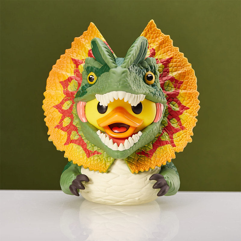 Ce Dilophosaurus se sent comme chez lui dans Jurassic Park, se pavanant comme s'il possédait l'endroit, jusqu'à ce qu'il se rende compte qu'il y a un public. Qui sont toutes ces créatures à l'allure étrange qui restent bouche bée ? Apparemment, ces créatures sont des canards en cosplay, Dilophosarus ne sait pas trop quoi en penser, alors autant les manger !