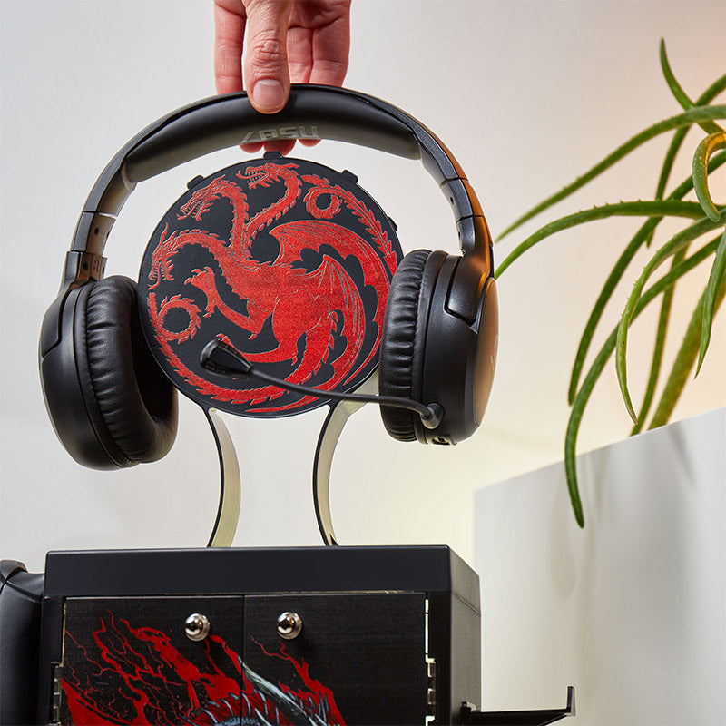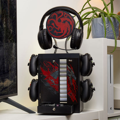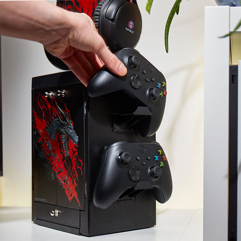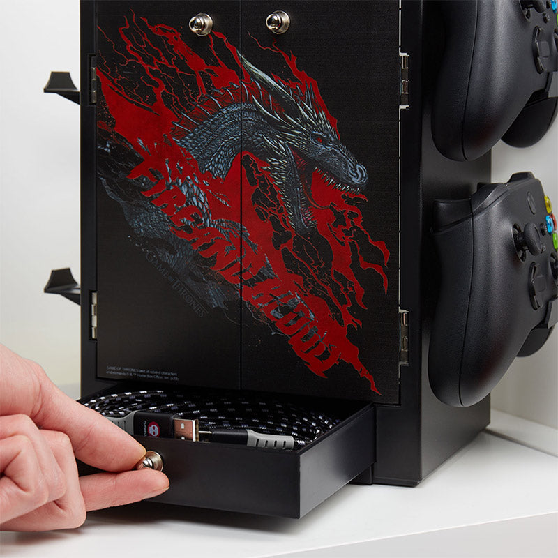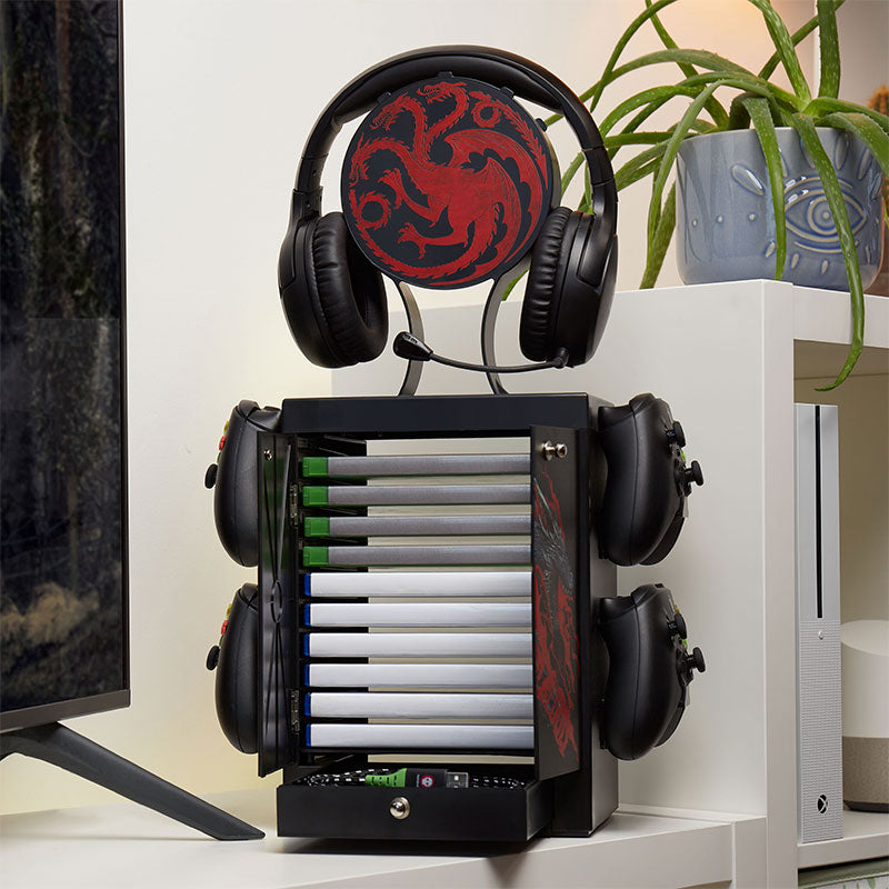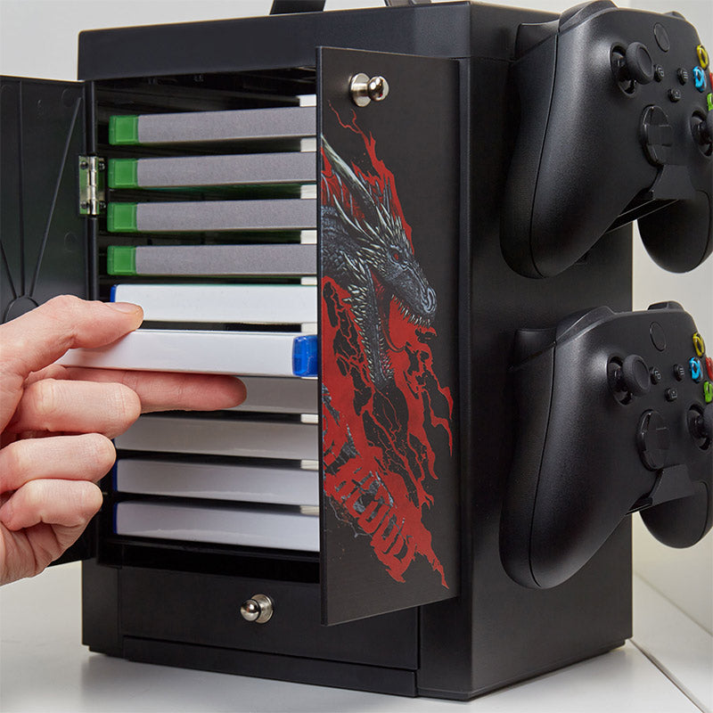 Vous aimez les jeux ? Vous aimez Game of Thrones ? Ce nouveau casier de jeu présente le design "Fire and Blood" comme un clin d'œil à la maison de Targaryen. Il peut contenir jusqu'à 10 de vos jeux Xbox One/Xbox Series X|S, jeux PS4/PS5 ou films. De plus, il y a beaucoup d'espace pour ranger tous vos essentiels de jeu, qu'il s'agisse de manettes, de câbles ou d'autres accessoires.