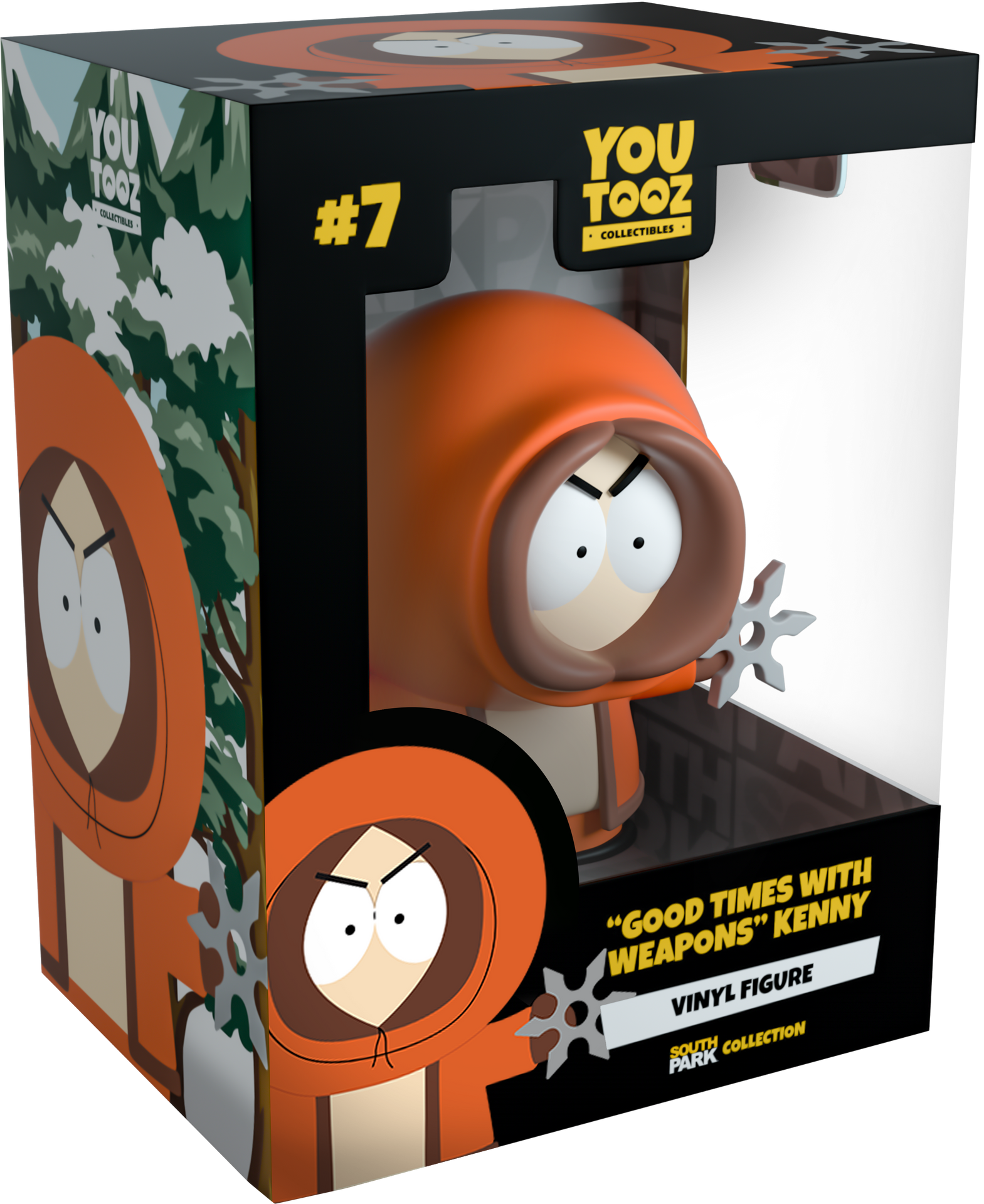 Kenny returns and is ready to cause grievous bodily harm as Kensuke! Standing at 3.4 inches tall he’s posed brandishing a sharp shuriken threateningly in each outstretched arm. His furrowed brows radiate pure rage from his tightened hood as his bright orange jacket is spread open at the front to expose his bare chest, showing he’s ready for business. The exterior of his packaging shows a peaceful snow covered ravine. While the interior is a simple greyscale repeating pattern of the South Park Logo The protective sleeve shows the four boys' faces peeking from the corners of the packaging over a rich black background. This collectible ships in a matte, embossed, protective outer sleeve and a custom sized plastic protector for maximum protection during shipping.