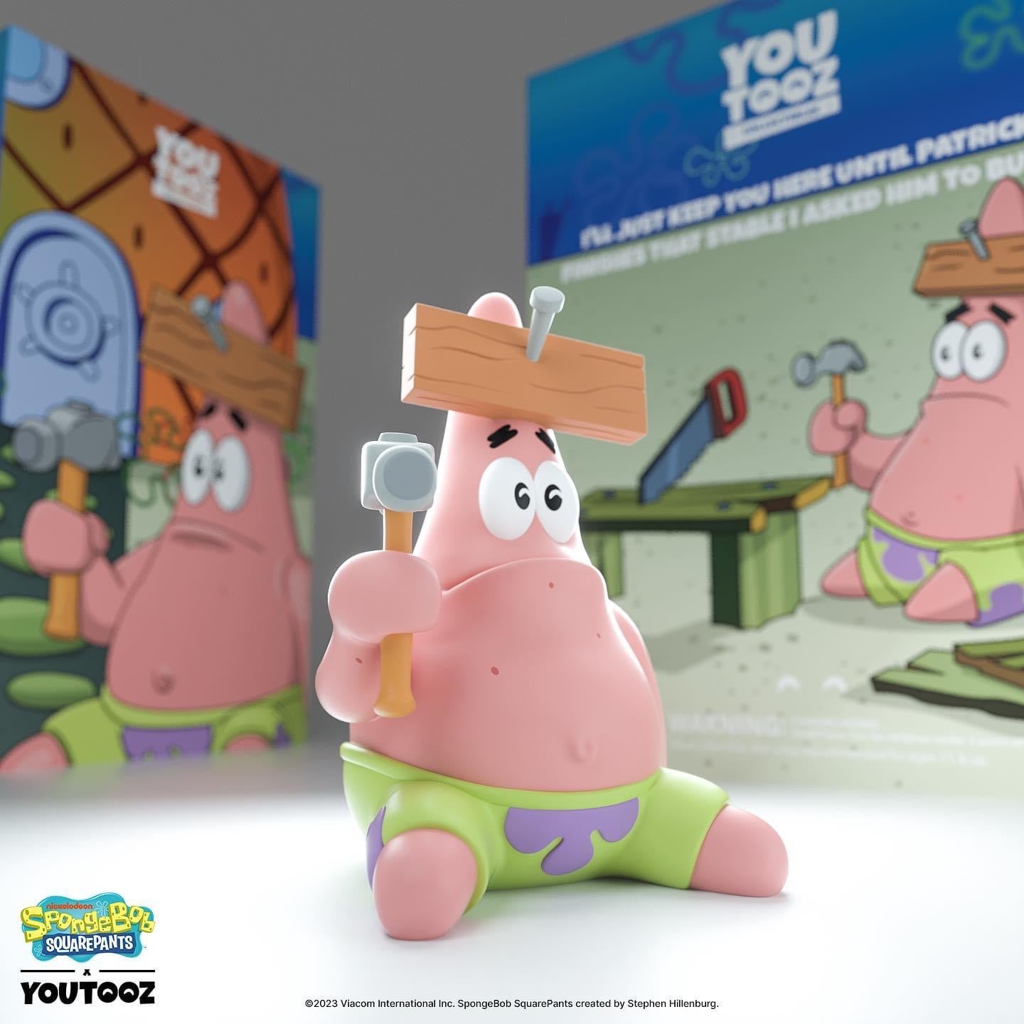 Patrick est revenu sur Youtooz pour effectuer quelques réparations ! Assis à 4 pouces de hauteur avec un regard vide dans les yeux et un léger froncement de sourcils traversant sa large bouche, une planche de bois marron a été enfoncée sur son front avec un clou singulier. H-comment est-il arrivé là ? ! Vêtu de son short vert et violet habituel, ses jambes dépassent vers l'avant alors qu'il tient un marteau à griffes vers le haut dans sa main droite. L'extérieur de son emballage voit Patrick entouré d'outils et de bois alors qu'il tente de terminer son projet de construction. Alors que l'intérieur est un dégradé bleu océan collé avec des illustrations de Bob l'éponge. La pochette de protection est imprimée avec le motif triangulaire jaune vif de Bob l'éponge, car sa silhouette peut être vue à travers la grande fenêtre transparente à l'avant.