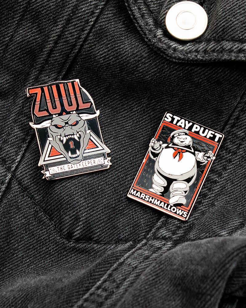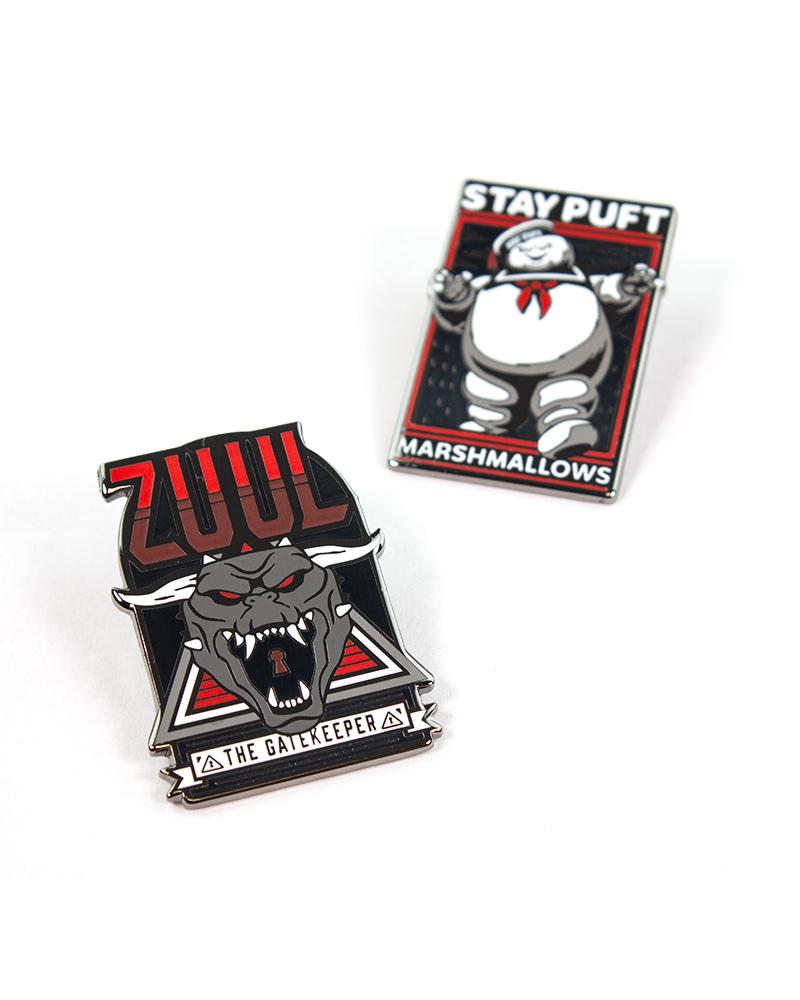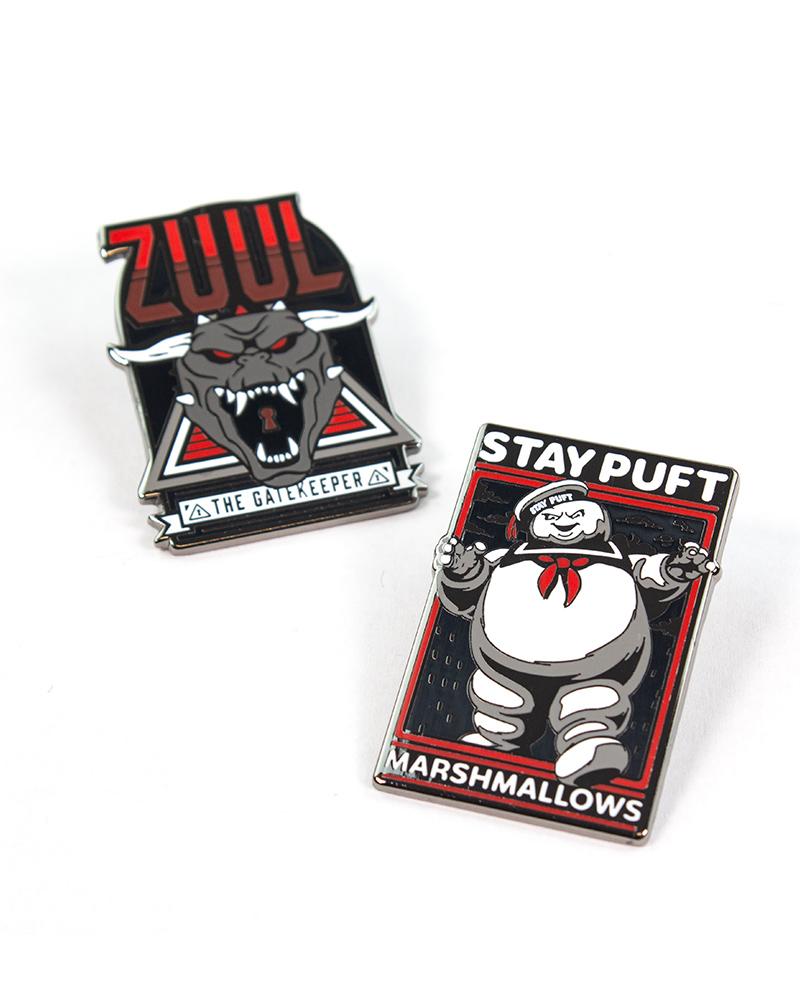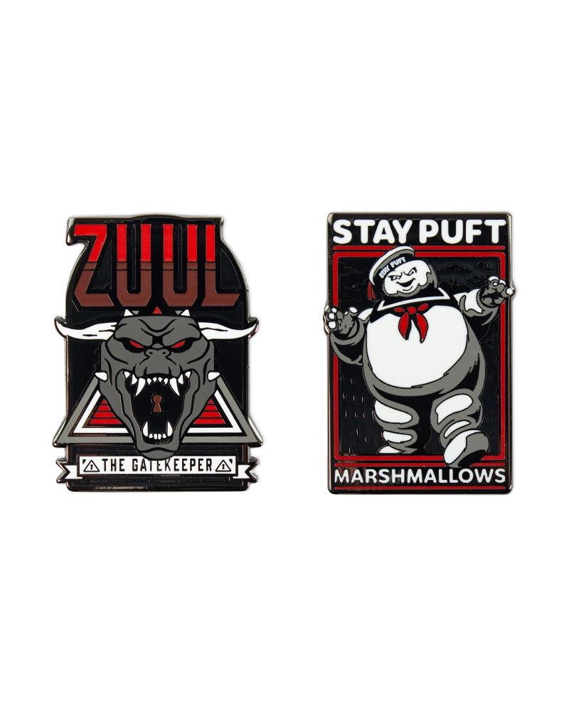 - Deux broches en métal émaillé dur de qualité supérieure avec une finition brillante avec des motifs Zuul et Marshmallow Man sur une carte de support.