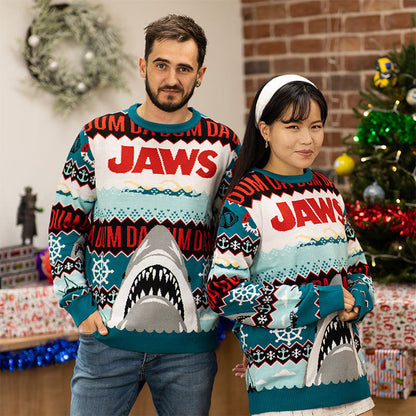 da dum ... dum dum ... čo sa tam blíži? Je to Santa Claus, ktorý zostupuje cez krb? Alebo je to vrahový žralok hľadá svoju ďalšiu korisť? Radšej by sme mali prvú voľbu, ale tentokrát to tak nie je. Tento 100% pletený vysokoškolský vianočný sveter predstavuje symbol ilustráciu plagátu filmového plagátu Jaws spolu s malými ďalšími slávnostnými dekoráciami bodkovanými všade.